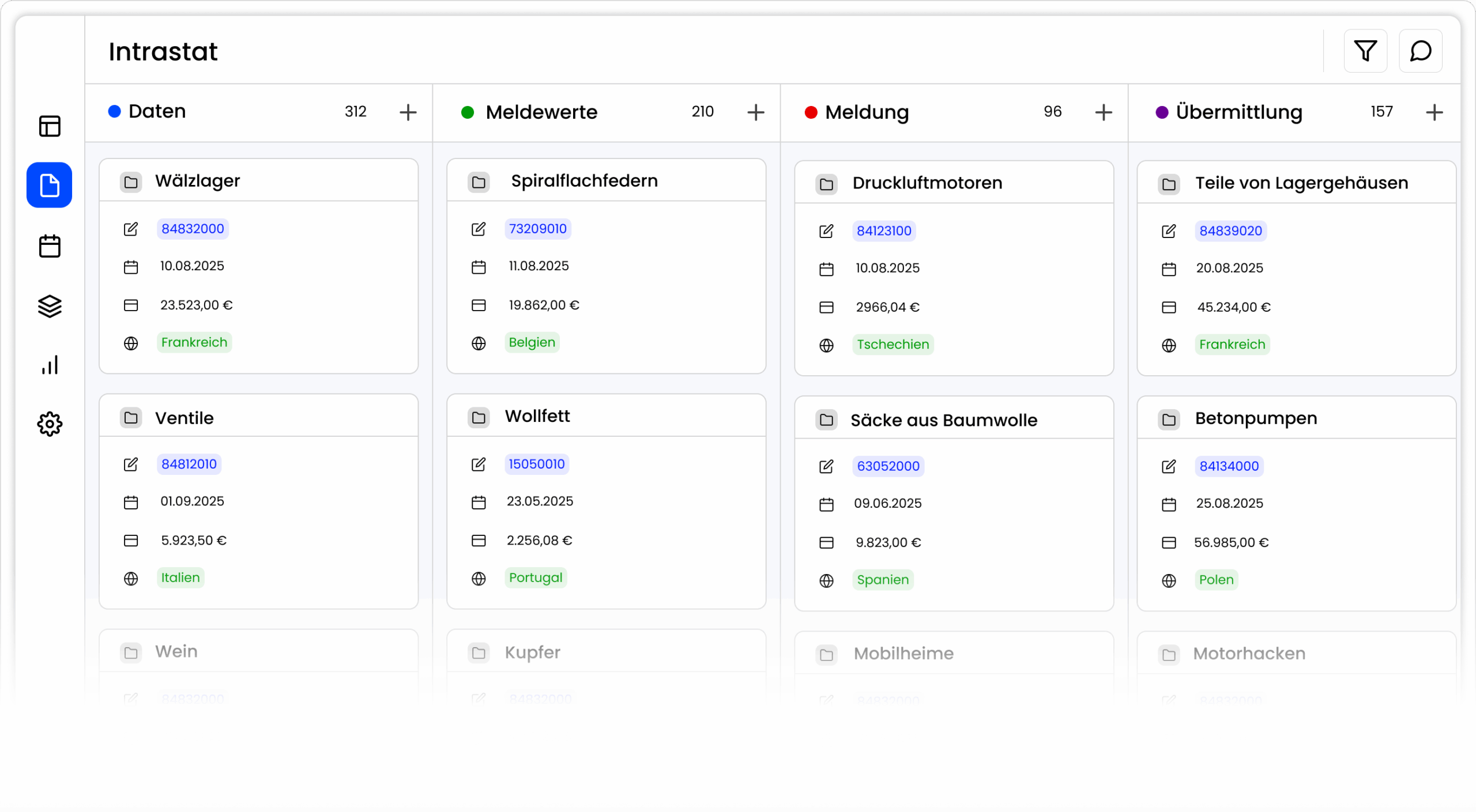 Wir prüfen die Angaben, ergänzen Pflichtfelder (z. B. Ursprungsland, USt-ID) und bereiten alles meldefertig auf.